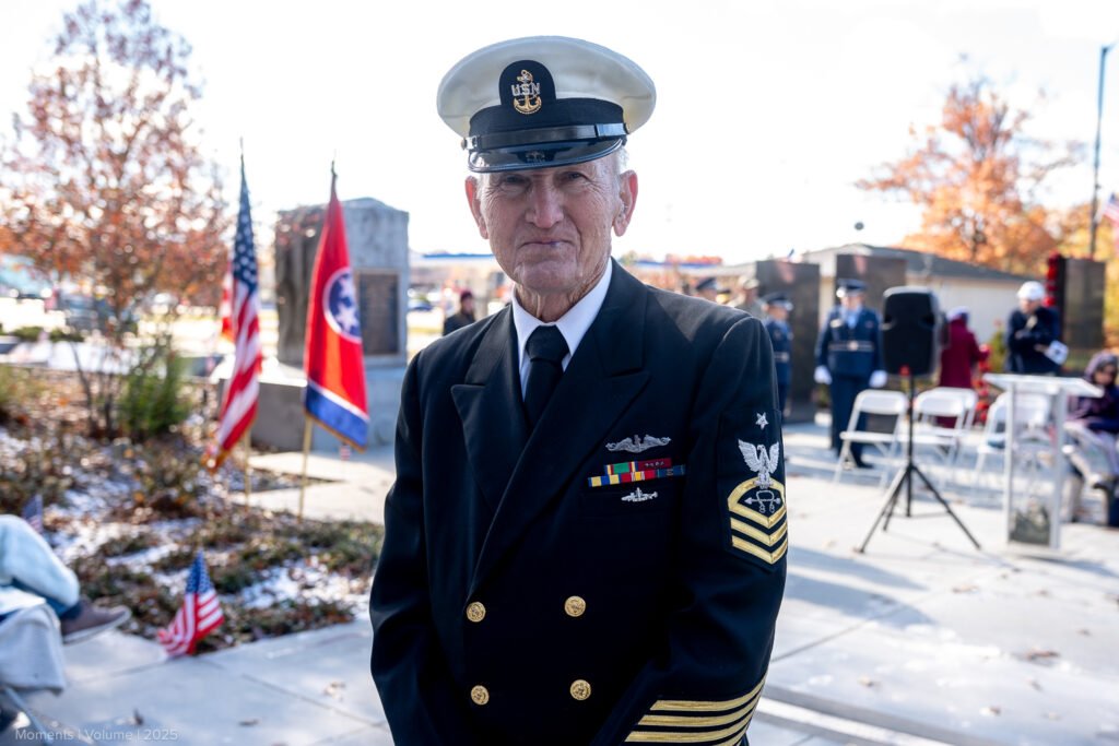 He stood tall, unmistakably so. An officer’s posture. Navy dress uniform. Submarine insignia. He looked exactly as a lifetime of service would suggest he should look—composed, disciplined, and striking in his stillness. I had to take his photo. I interrupted his conversation with Mayor Shull, introduced myself, and asked a few questions.
